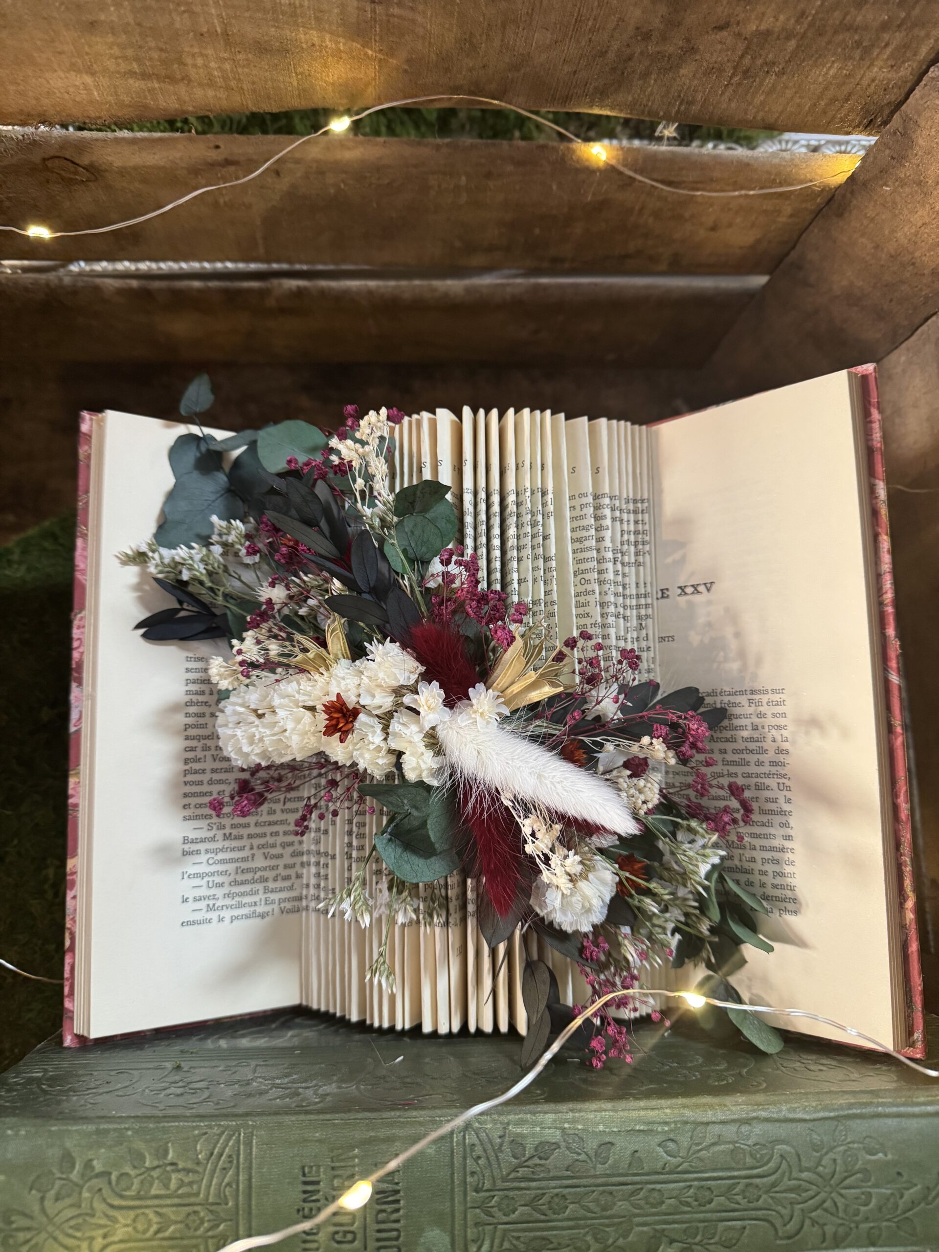 Livre rouge fleuries avec des fleurs séchées et stabilisées.